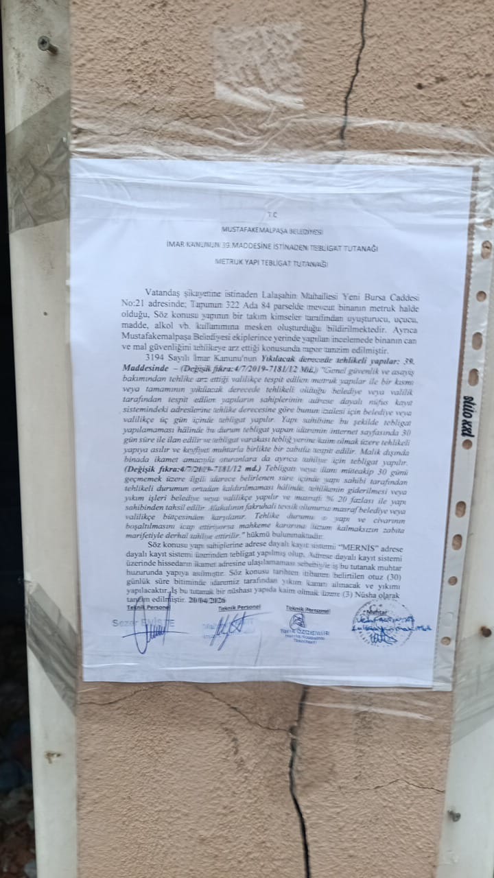 5- T.C. MUSTAFAKEMALPAŞA BELEDİYE BAŞKANLIĞI İmar ve Şehircilik Müdürlüğü Metruk Bina İlanı