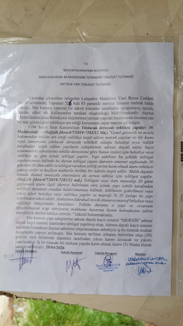 5- T.C. MUSTAFAKEMALPAŞA BELEDİYE BAŞKANLIĞI İmar ve Şehircilik Müdürlüğü Metruk Bina İlanı