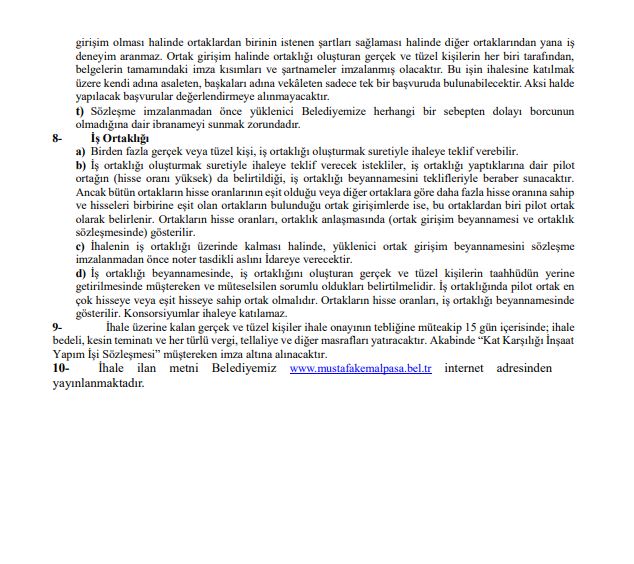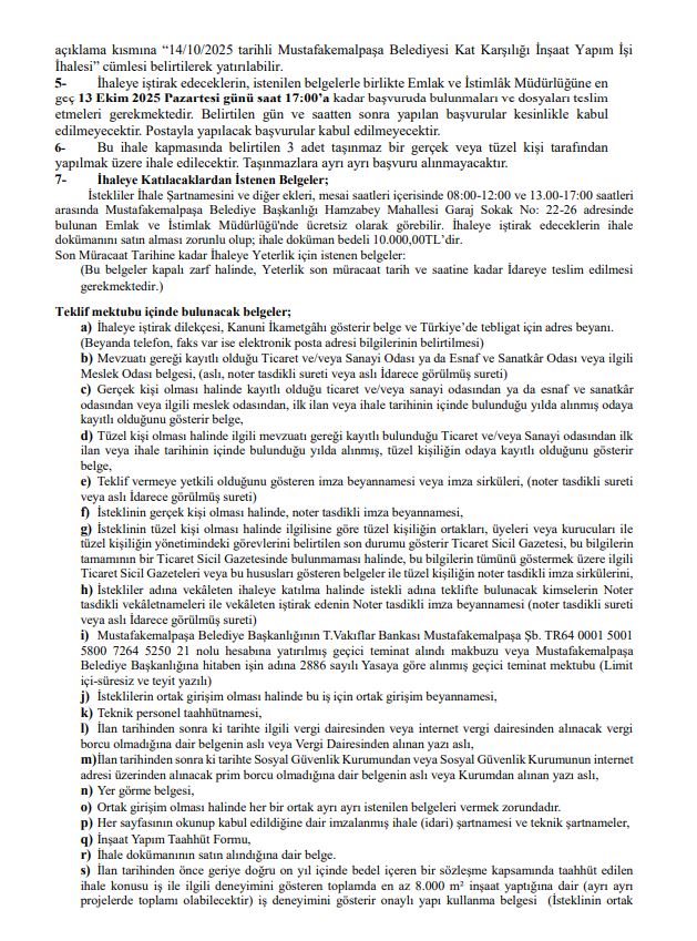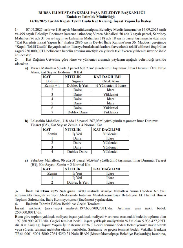 MUSTAFAKEMALPAŞA BELEDİYE BAŞKANLIĞI 14/10/2025 Tarihli Kapalı Teklif Usulü Kat Karşılığı İnşaat Yapım İşi İhalesi