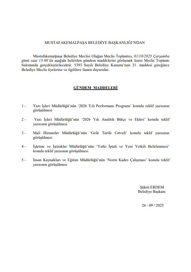 T.C. MUSTAFAKEMALPAŞA BELEDİYE BAŞKANLIĞI İmar ve Şehircilik Müdürlüğü Kurul Kararı Askı İlanı