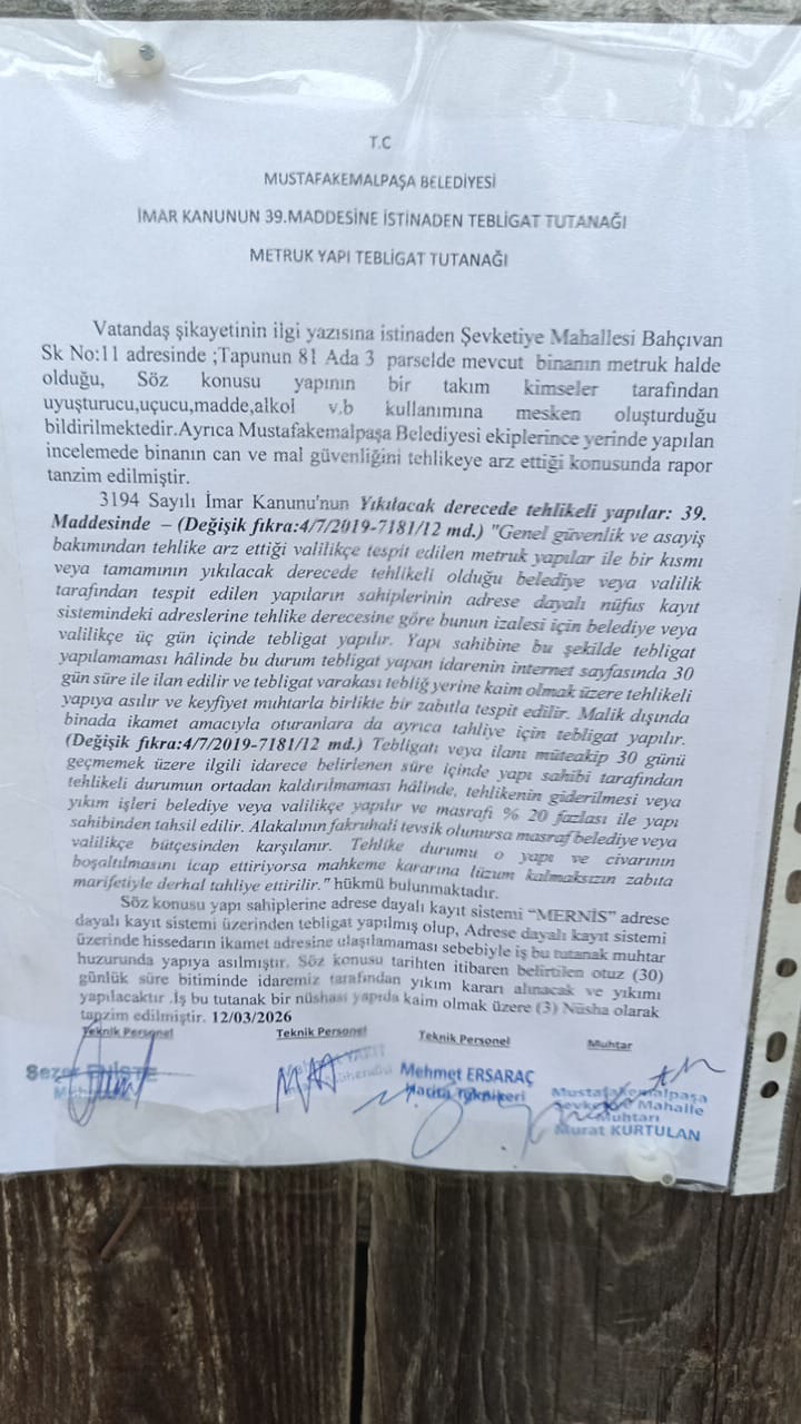 T.C. MUSTAFAKEMALPAŞA BELEDİYE BAŞKANLIĞI İmar ve Şehircilik Müdürlüğü Metruk Bina İlanı