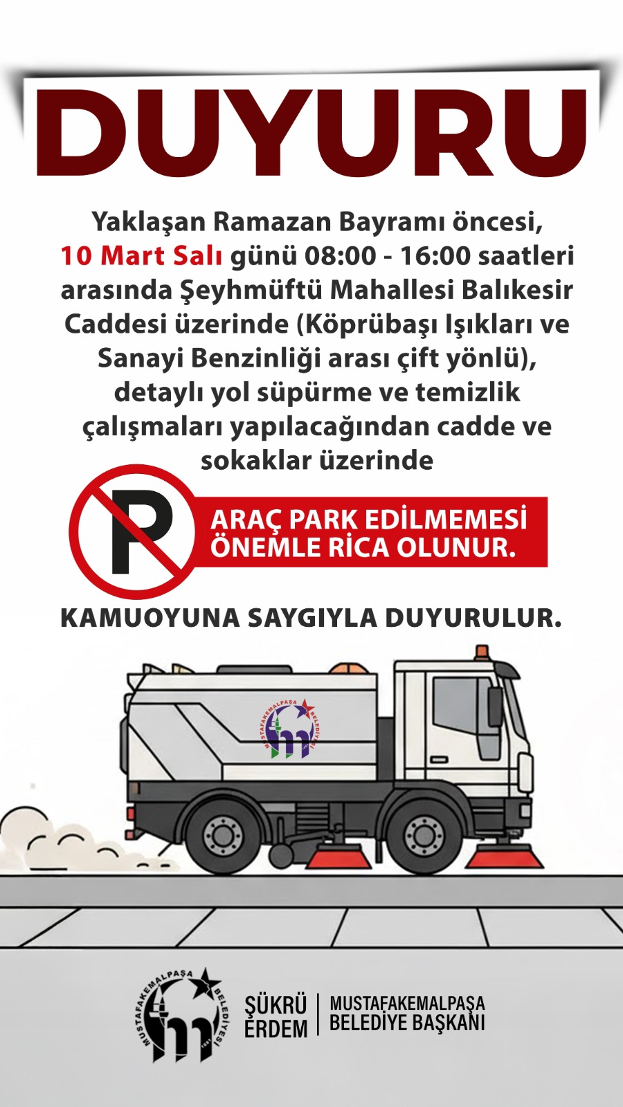 Yol Süpürme ve Temizlik Çalışmaları Hakkında Duyuru